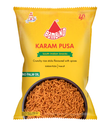 Bambino Karampusa is a classic South Indian snack that brings together the authentic flavors and traditions of Indian cuisine. Made from high-quality chickpea flour, this crispy and crunchy delicacy is seasoned with a perfect mix of aromatic spices that deliver a mildly spicy yet delicious flavor. It has been a household favorite for generations, offering a nostalgic taste that reminds many of home, festivals, and joyful family gatherings. Each bite of Bambino Karampusa reflects the care and quality that Bambino puts into creating snacks that combine taste, freshness, and nutrition.